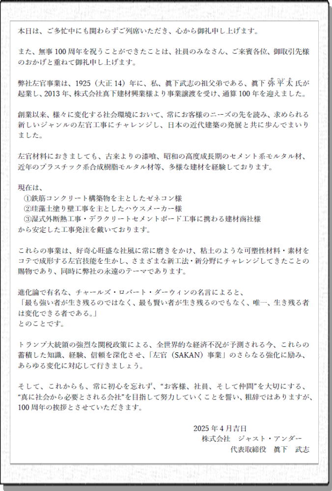 さて このたび 弊社は本年2025年4月をもって創業100年の佳節を迎えることとなりました